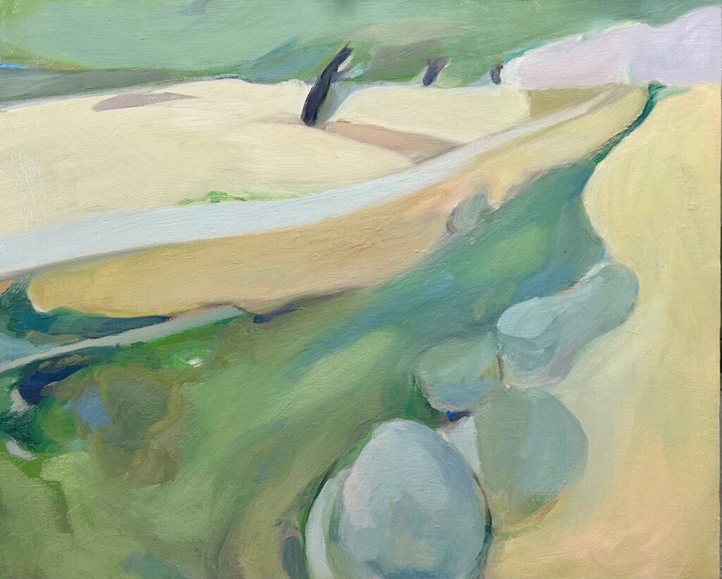 色彩が画面内で重なり、筆跡のリズムによって独自の空間を生み出す画面構成を模索しながら油画作品を制作している。近年の作品は筆跡に意識を向けその軌跡と絵具の厚みは、描く行為そのものの痕跡として層をなし、一瞬一瞬の変化を捉え、おり重なる色彩と画面の流動的な流れ、それら全てが交錯する多彩な作品を目指す。また、小作品は支持体そのものに厚みを持たせ、側面や物理的な奥行きを画面構成に取り込むことで、空間にせり出す存在として提示している。色彩が画面上で混ざり合いながら境界を揺るがし、新たな広がりを生み出していく。